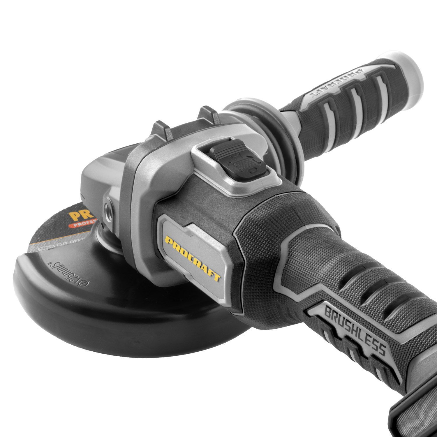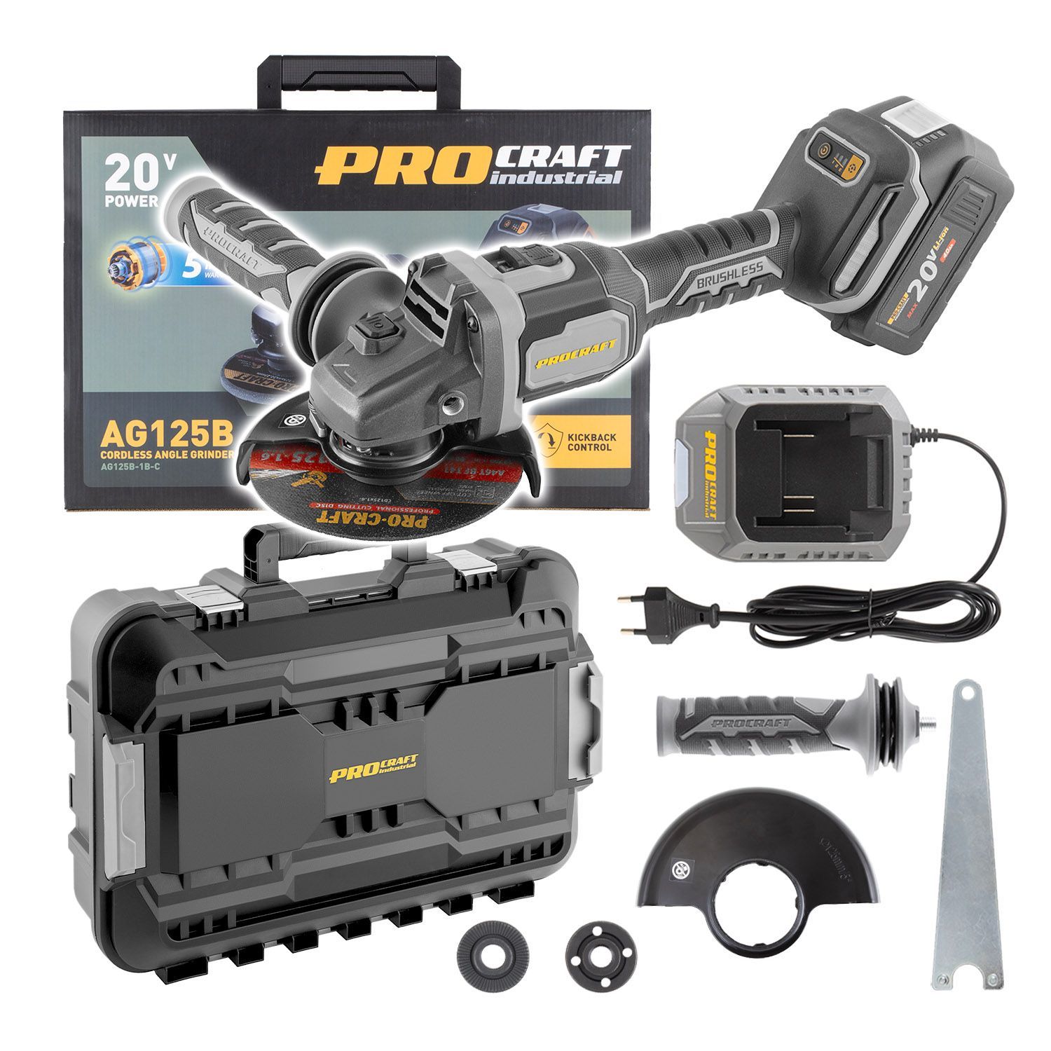 Aku úhlová bruska Procraft AG125B s bezuhlíkovým motorem, třemi rychlostmi (4500/6500/9500ot./min) a průměrem kotouče 125 mm. Lehká (1,80 kg), s regulací otáček a protiskluzovým povrchem. Kickback control. Součástí balení: baterie 20V 4Ah, nabíječka.