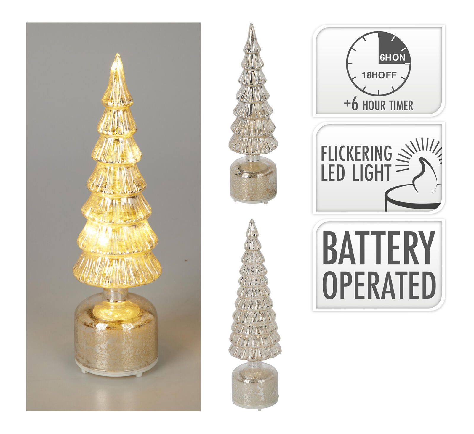 Svítící skleněný strom, s efektem plápolajícího světla, je elegantním doplňkem pro sváteční období.