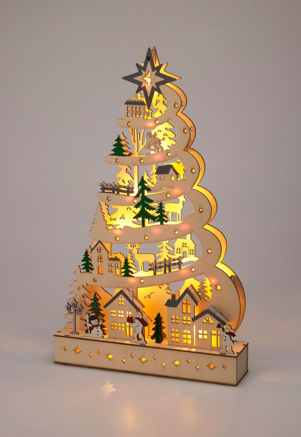 LED dřevěný strom s drobnými vánočními motivy vykouzlí tu pravou sváteční atmosféru.