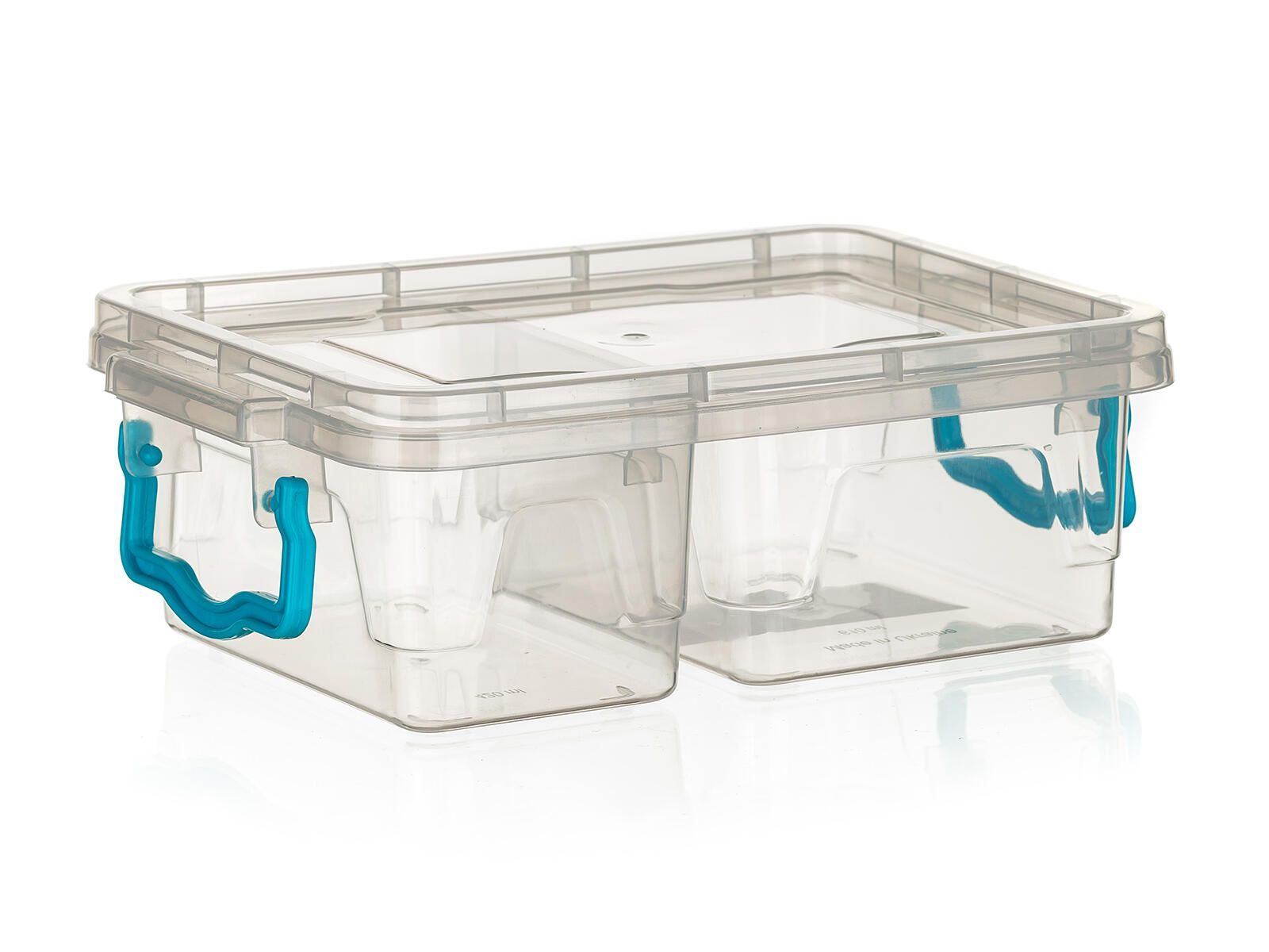 Dělená dóza GEMA s tyrkysovými madly má široké využití nejen v kuchyni, díky dvěma přihrádkám a transparentnímu provedení je velmi přehledná.