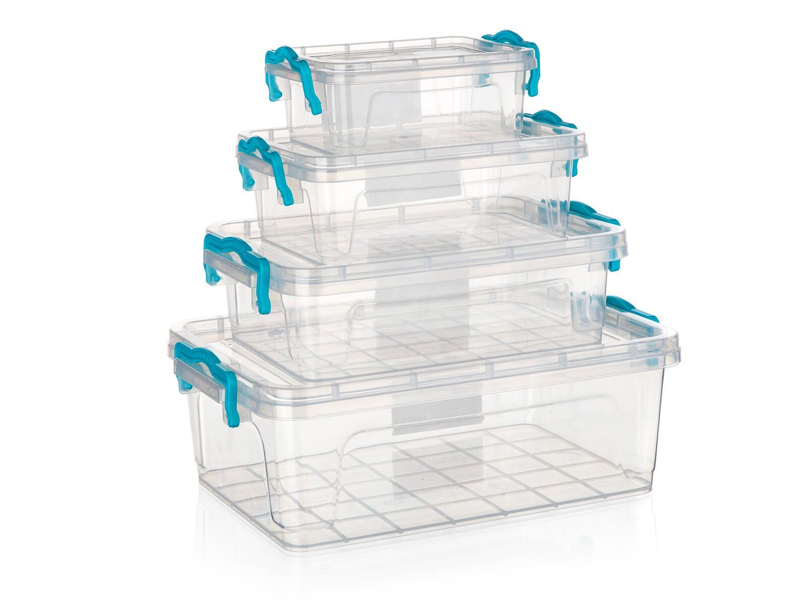 Sada čtyř plastových multifunkčních boxů GEMA o s tyrkysovými madly je vhodná nejen pro ukládání předmětů, ale i jejich přepravu.