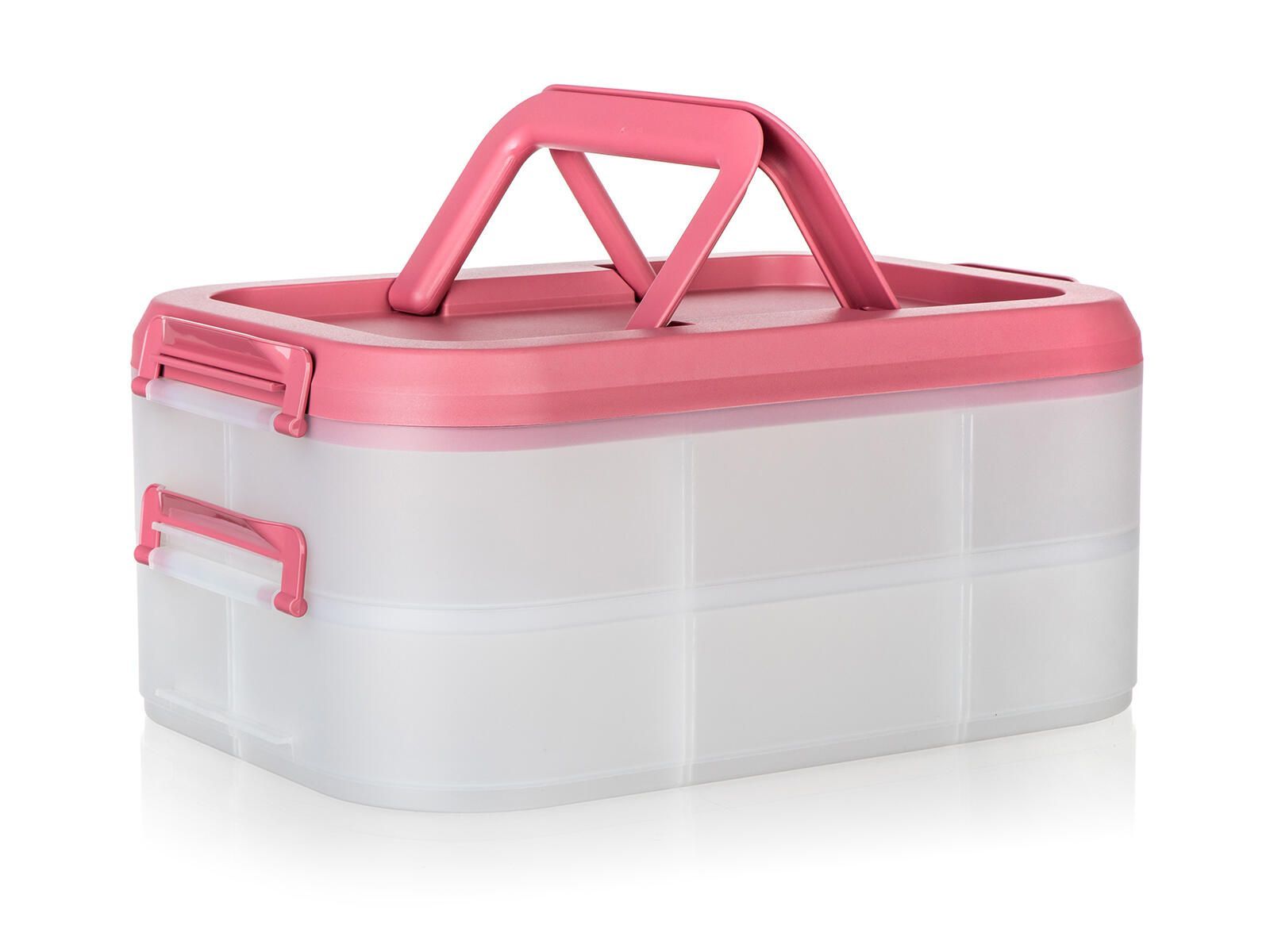 Party box obsahuje 2 úložná transparentní patra. Držadla, ucha a víko jsou v malinové barvě.