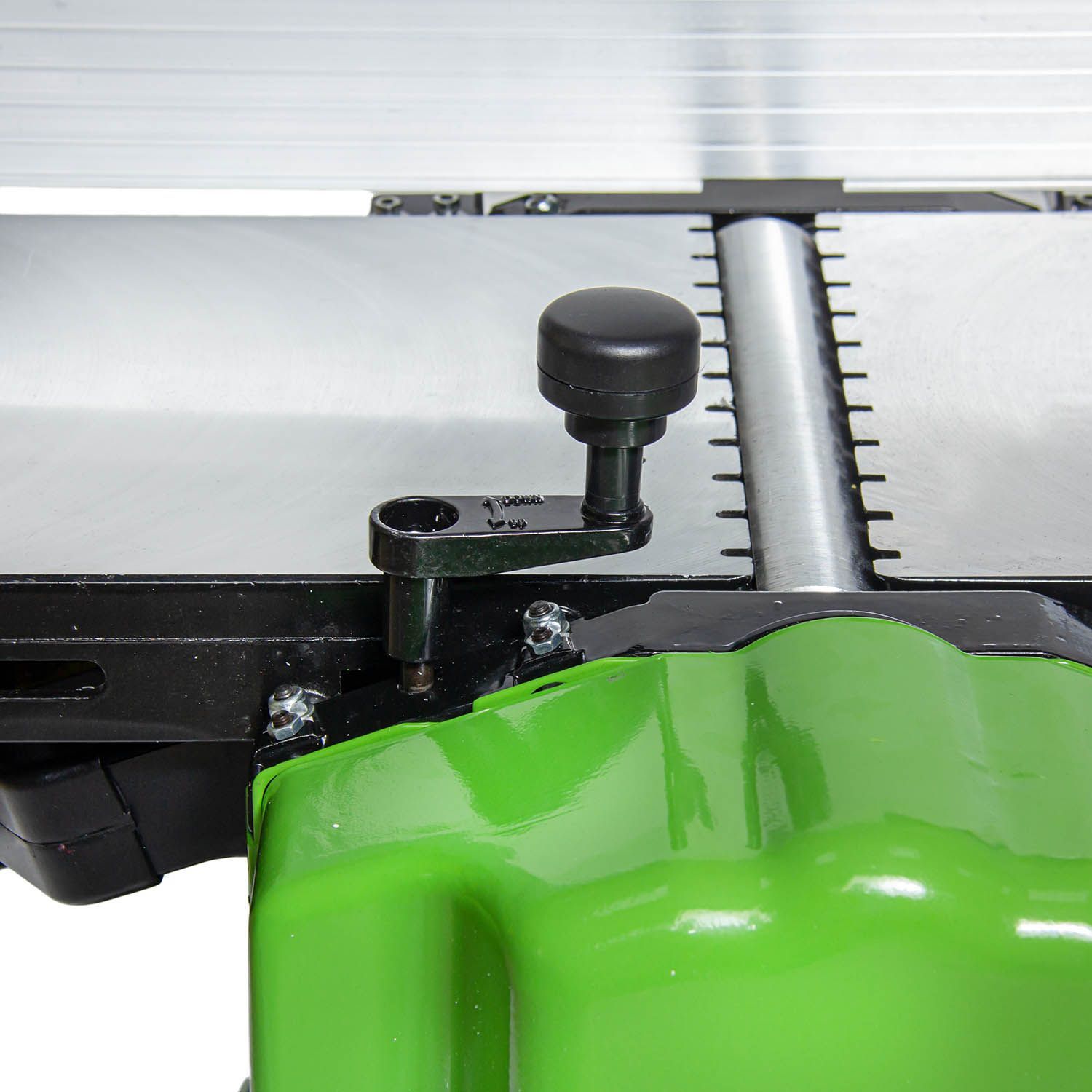 Podpěrné protahovací válce Příkon (W) 1800 Otáčky (min.-1) 8000 Rychlost posuvu (m/min) 6 Max.šířka hoblování (mm) 254 Hloubka hoblování (mm) 0-3 Výška hoblování (mm) 6-210 Počet nožů: 2 Rozměry dorazu (mm) 512X80 Úhel dorazu: 90°-135°