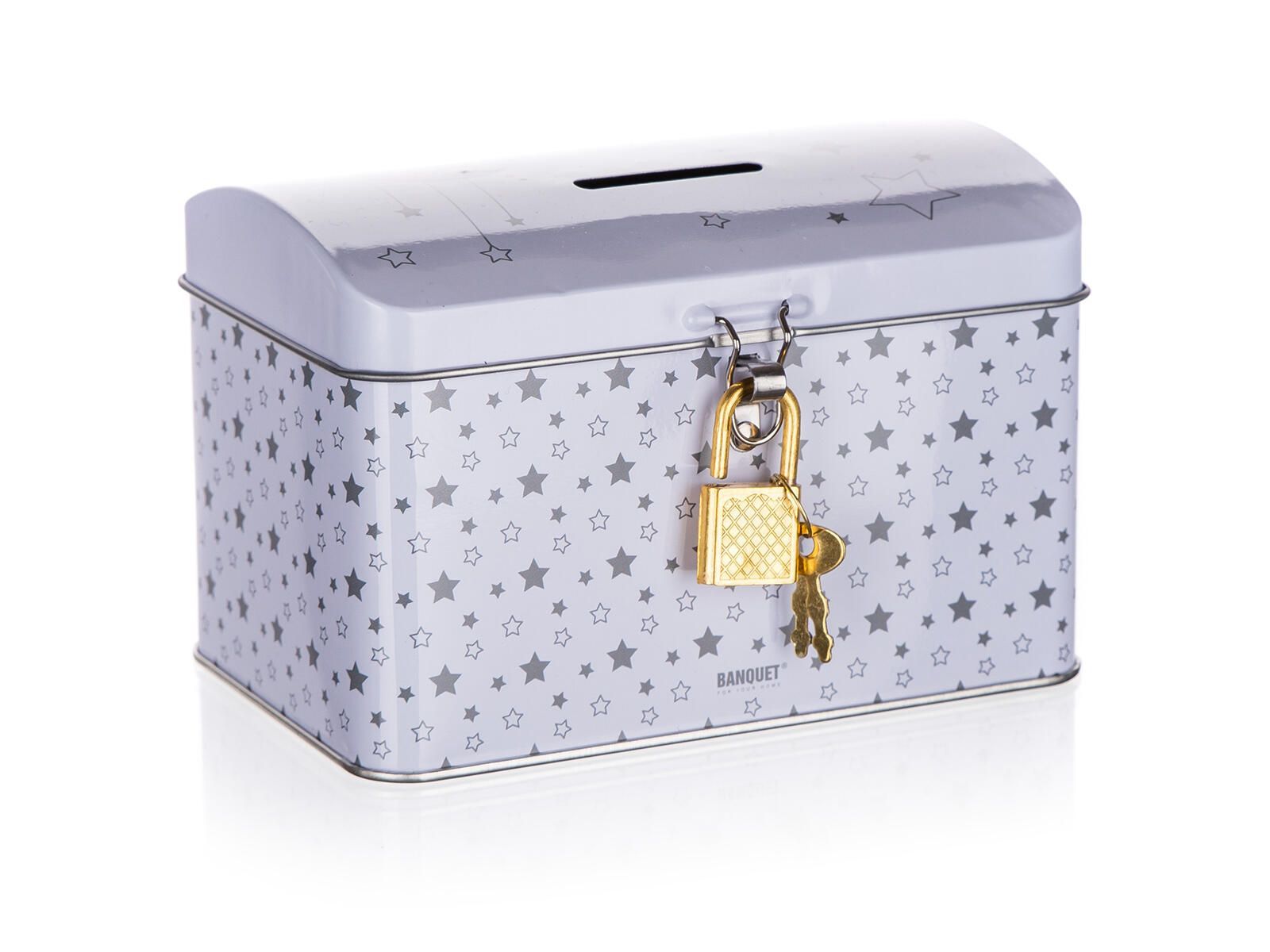 Plechovka - kasička truhla 4KIDS v bílé barvě s dekorem hvězdiček, vhodné pro šetření peněz.