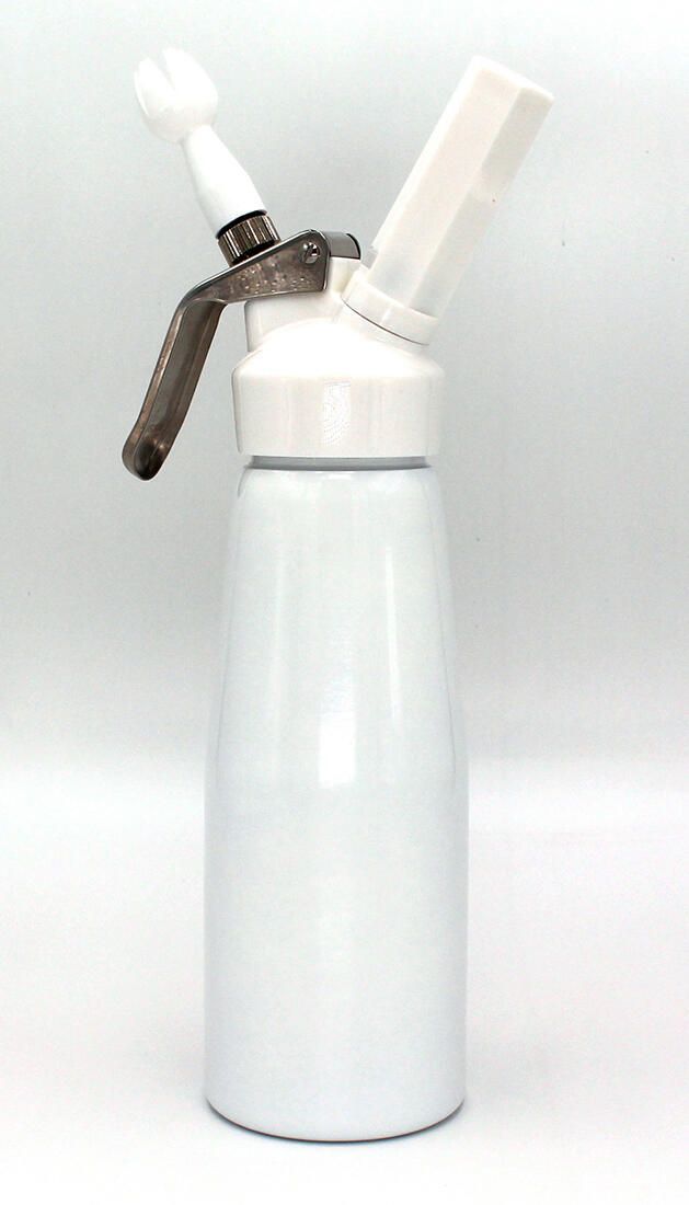 Bílá hliníková šlehačková láhev LISS HOME CHEF pro až půl litru smetany. Do láhve se nalévá jeden běžný kelímek nebo krabička smetany ke šlehání, maximum je 500 ml.