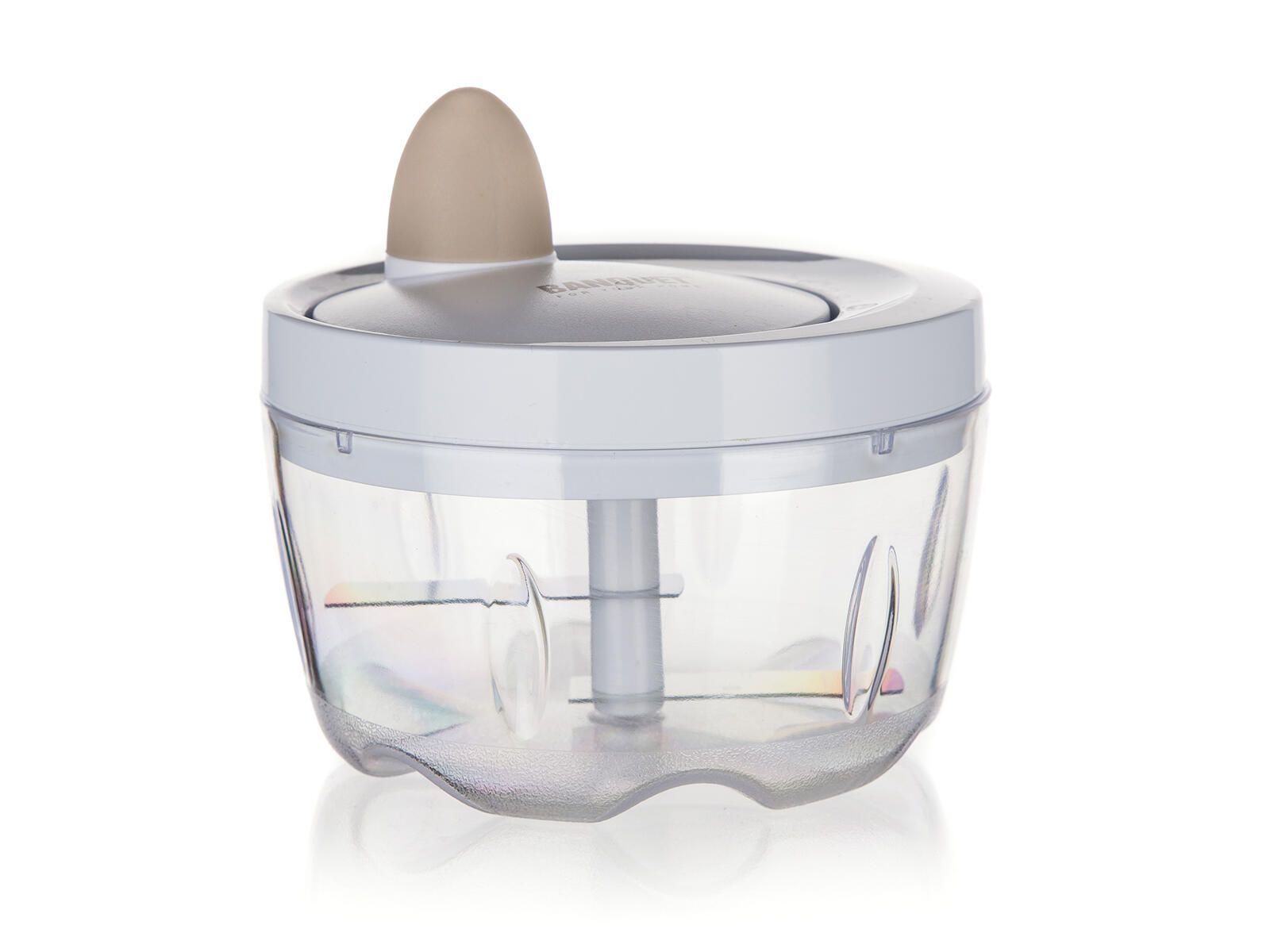 Ruční minisekáček CULINARIA Latte s plastovou transparentní miskou o průměru 10,5 cm a nerezovými noži. Ostré nerezové nože nasekají ovoce a zeleninu na malé kusy. Jednotlivé díly sekáčku se snadno udržují.