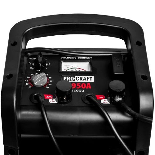 Nabíječka baterií se startovacím zdrojem Procraft PZ950A Napájení: 230 V/50 Hz Příkon: 2500 W Nabíjecí napětí: 12/24 V Nabíjecí proud: 85 A Kapacita akumulátoru: 20-1500 Ah Startovací proud: 950 A Hmotnost: 22 kg