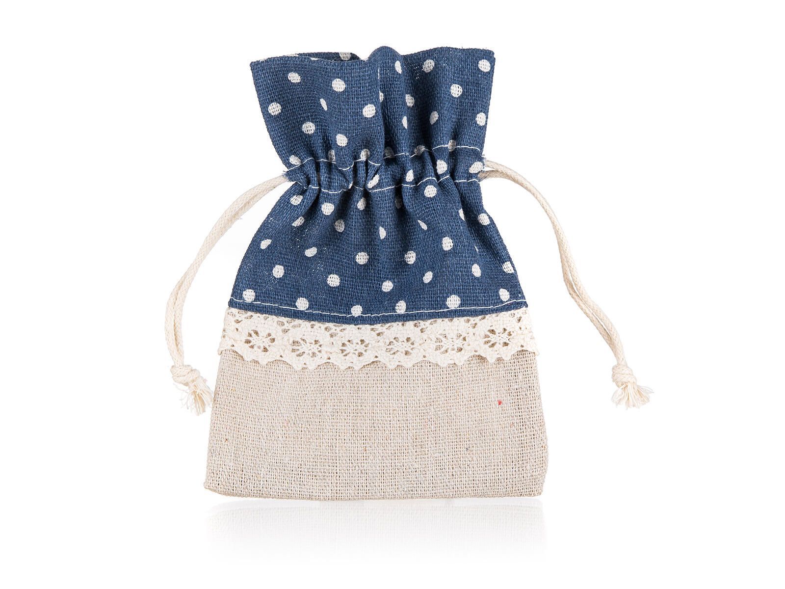 Přírodní dekorativní pytlík z bavlny, kombinace přírodní a modré bravy s dekorem bílé puntíky, rozměr: 10 x 13 cm. Vhodný pouze pro dekoraci.