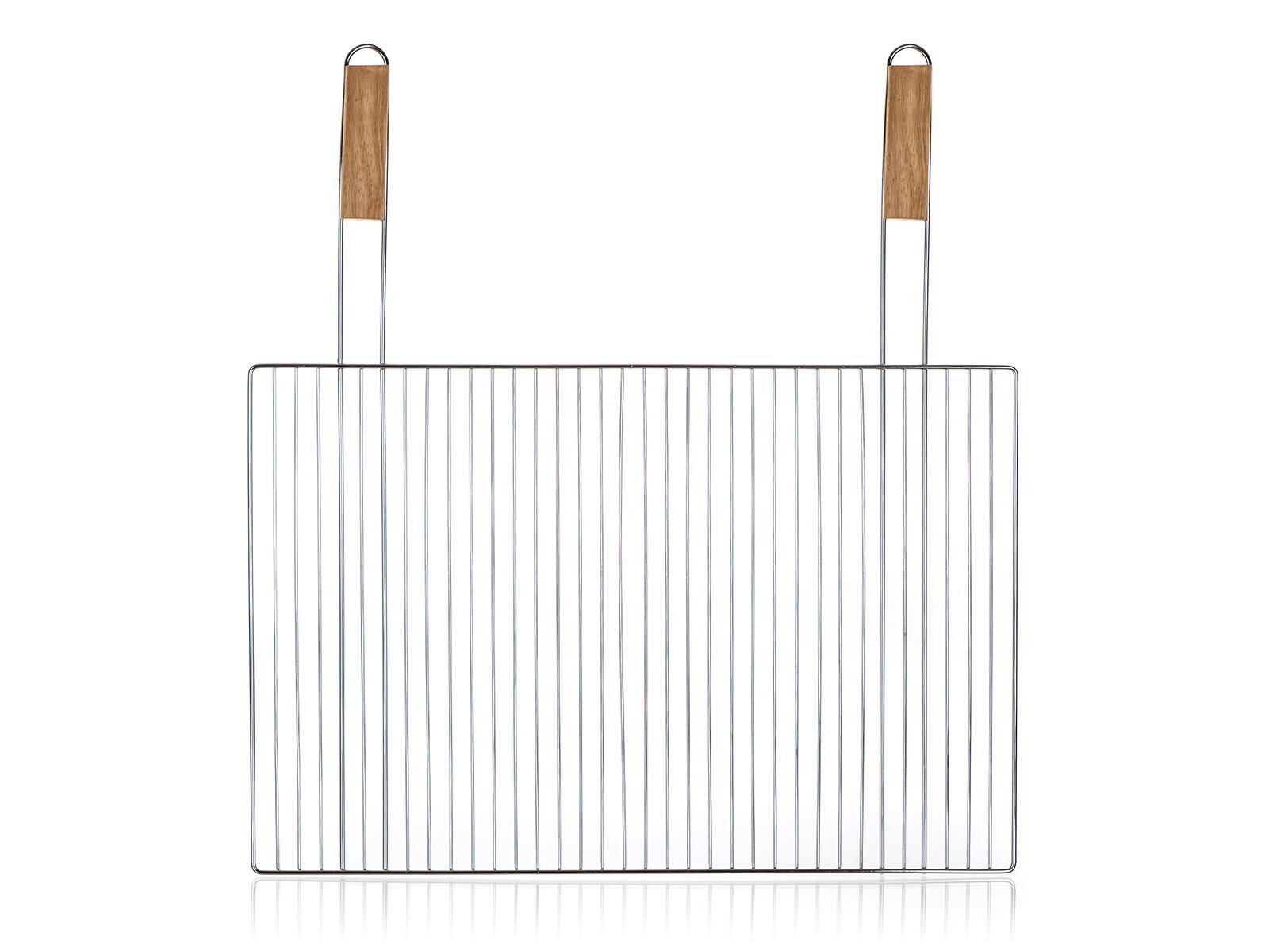 Hranatý grilovací rošt BBQ s dřevěnými rukojeťmi využijete pro snadné grilování masa, zeleniny apod.
