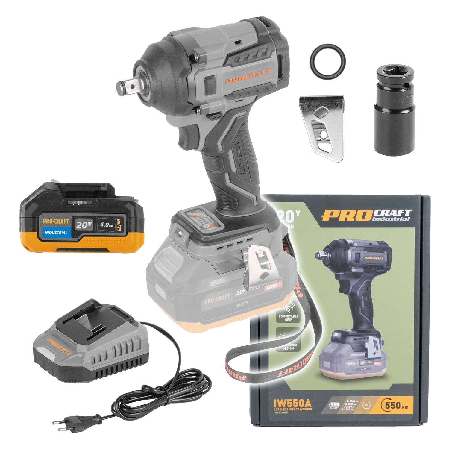 Sada aku rázový utahovák Procraft Industrial IW550A + baterie 20/4 Industrial a nabíječka C20/2 | SIW550Abb/20-4indu/C20-2