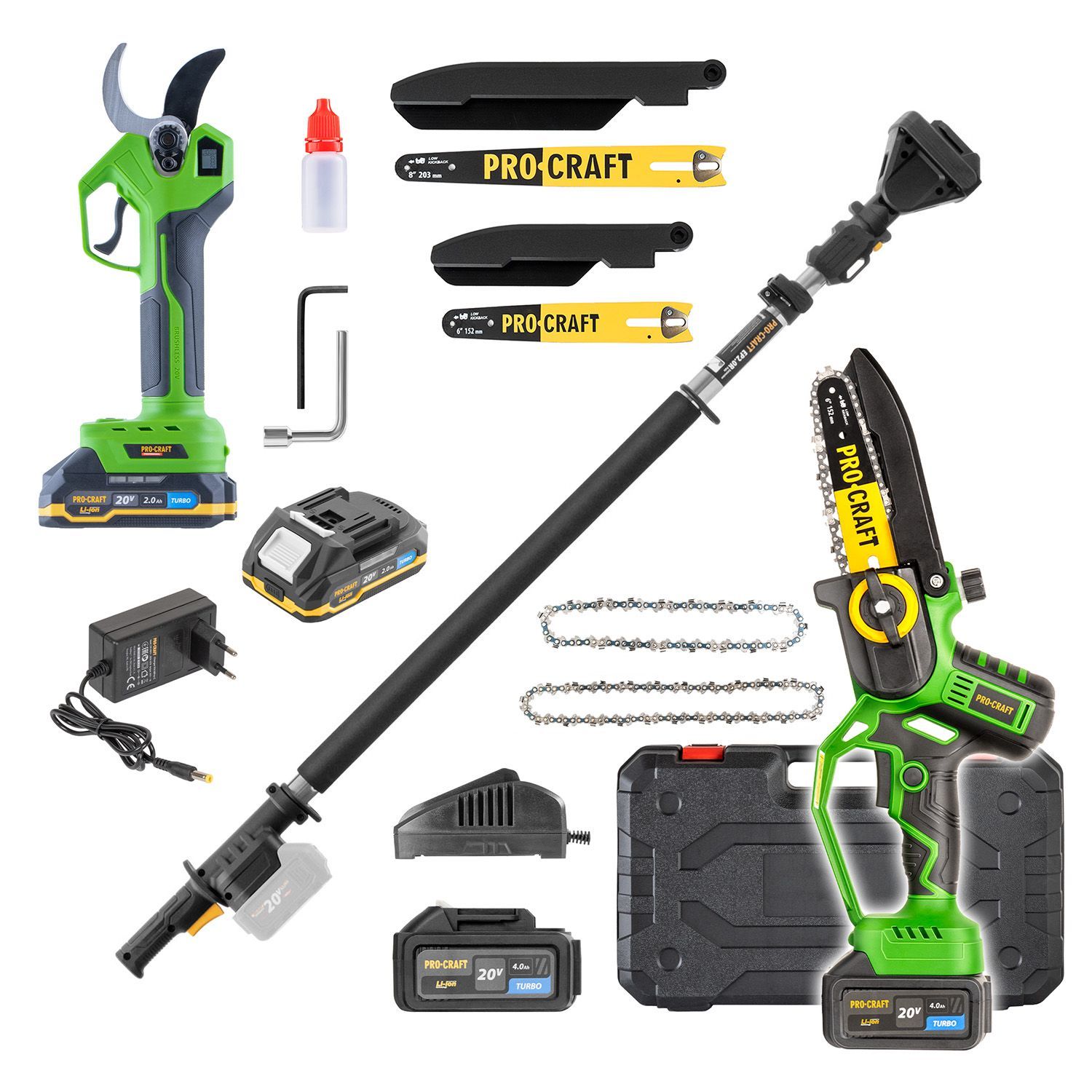 S aku zahradní sadou Procraft získáte profesionální výbavu pro efektivní a bezpečné prořezávání stromů i keřů. Kombinace silného řezu, precizního střihu a teleskopického dosahu umožňuje pohodlnou práci bez žebříku a bez omezení kabely.