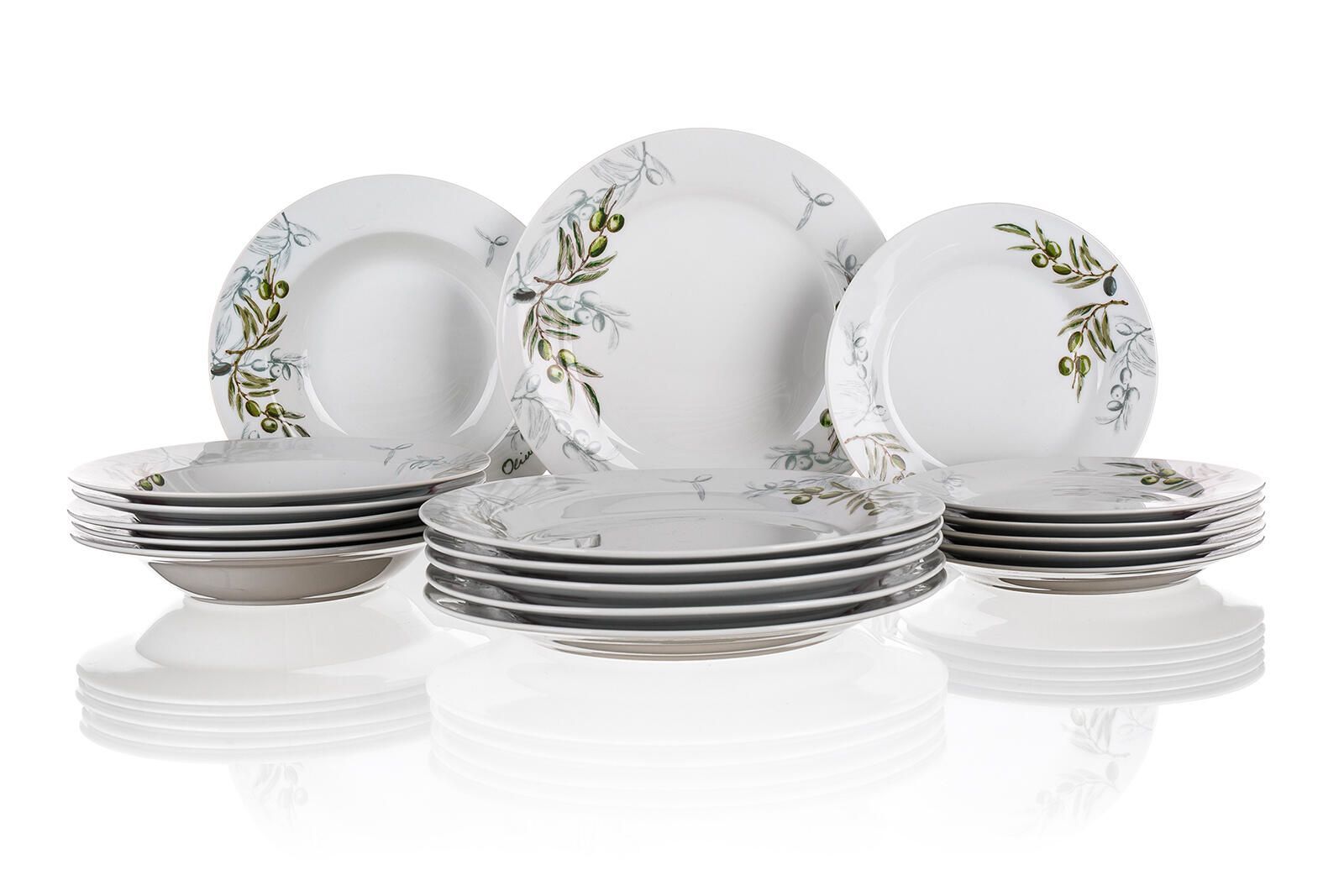 18dílná talířová sada OLIVES s dekorem olivy, je vyrobena z porcelánu.