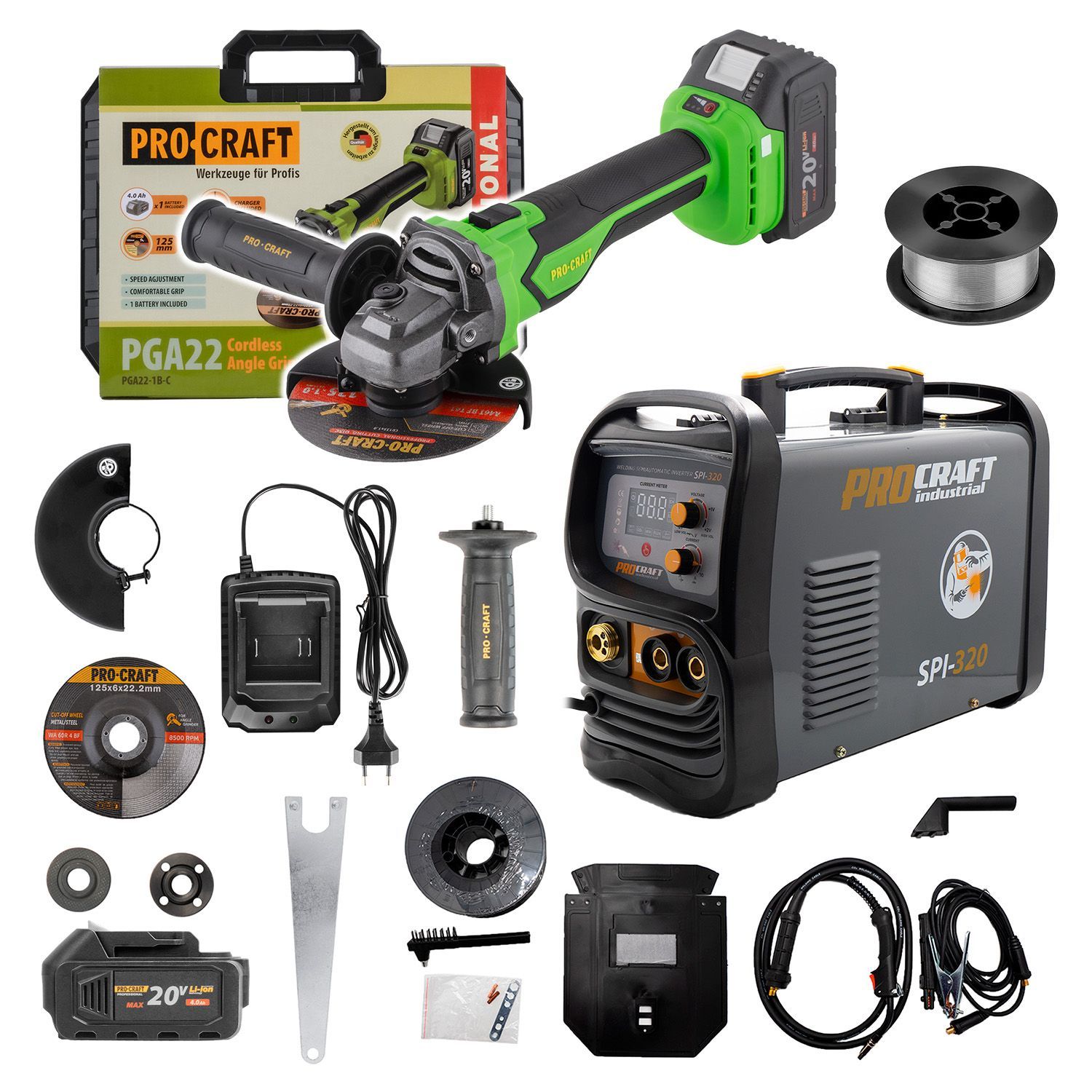 Výhodná sada svářecího poloautomatického invertoru Procraft SPI-320 a aku úhlové brusky PGA22-1B-C ihned k použití. Příkon (kW) 4,5 Regulační rozsah svářecích proudů (A) 20-140 Průměr drátu (mm) 1,6-4,0. Otacky: 3500/6000/8000min, Průměr kotouče(mm) 125.