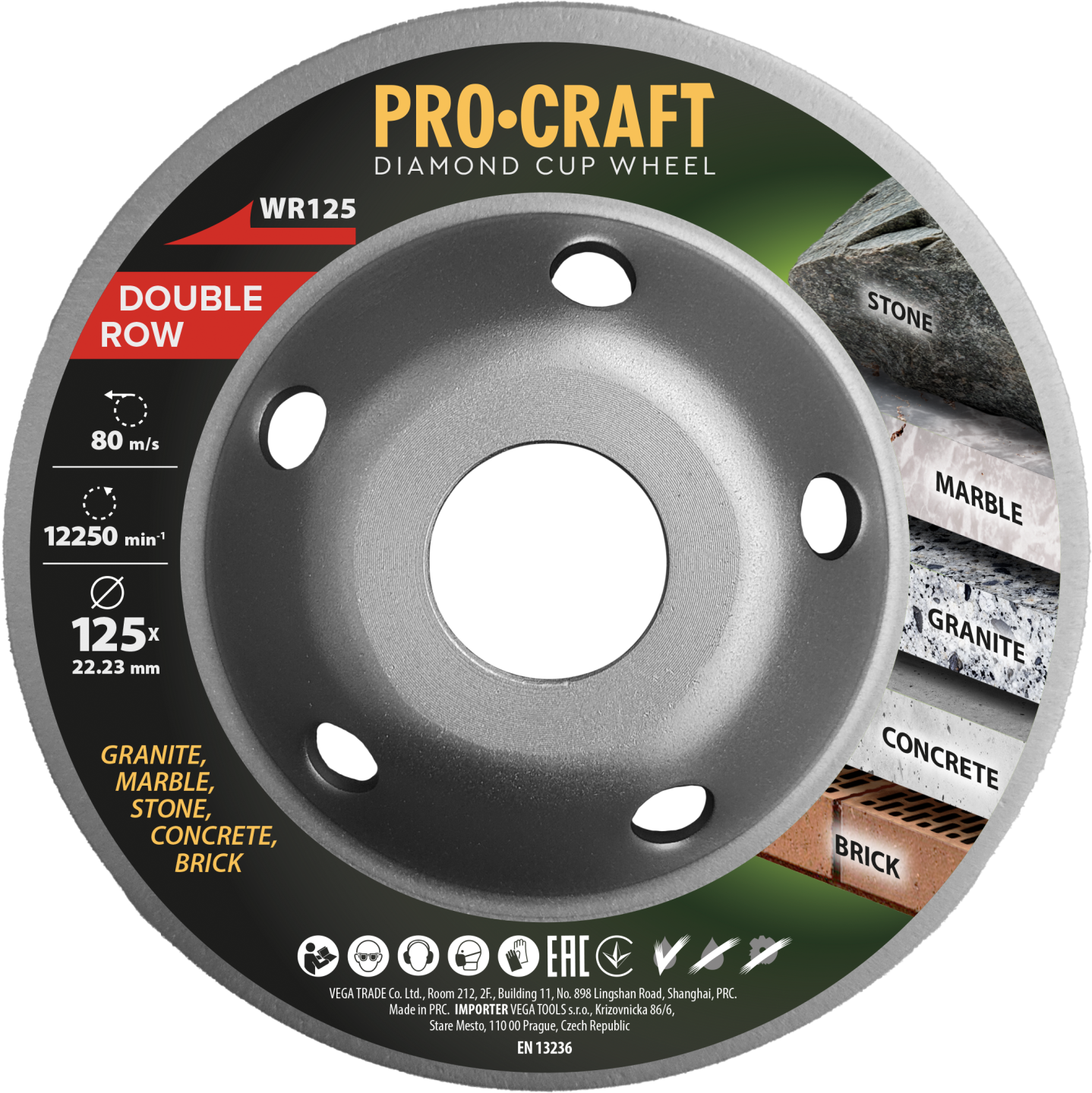 3× diamantové kotouče Procraft DS3.125 (125 mm): Určené pro řezání dlažby, betonu, kamene, cihel, keramiky a stavebních materiálů.