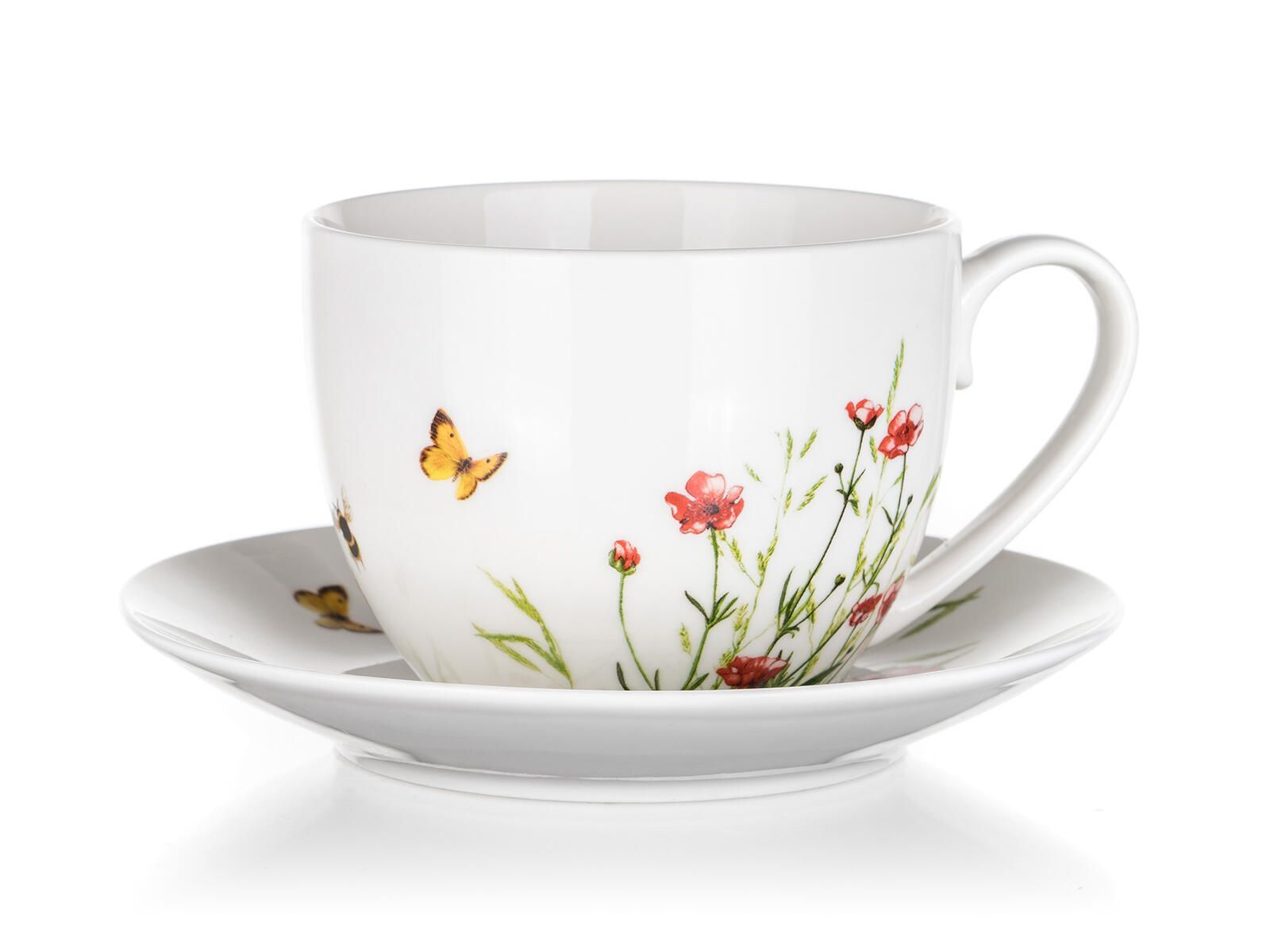Šálek s podšálkem MEADOW s krásným květinovým vzorem se hodí k podávání kávy nebo čaje při všedních i svátečních příležitostech.