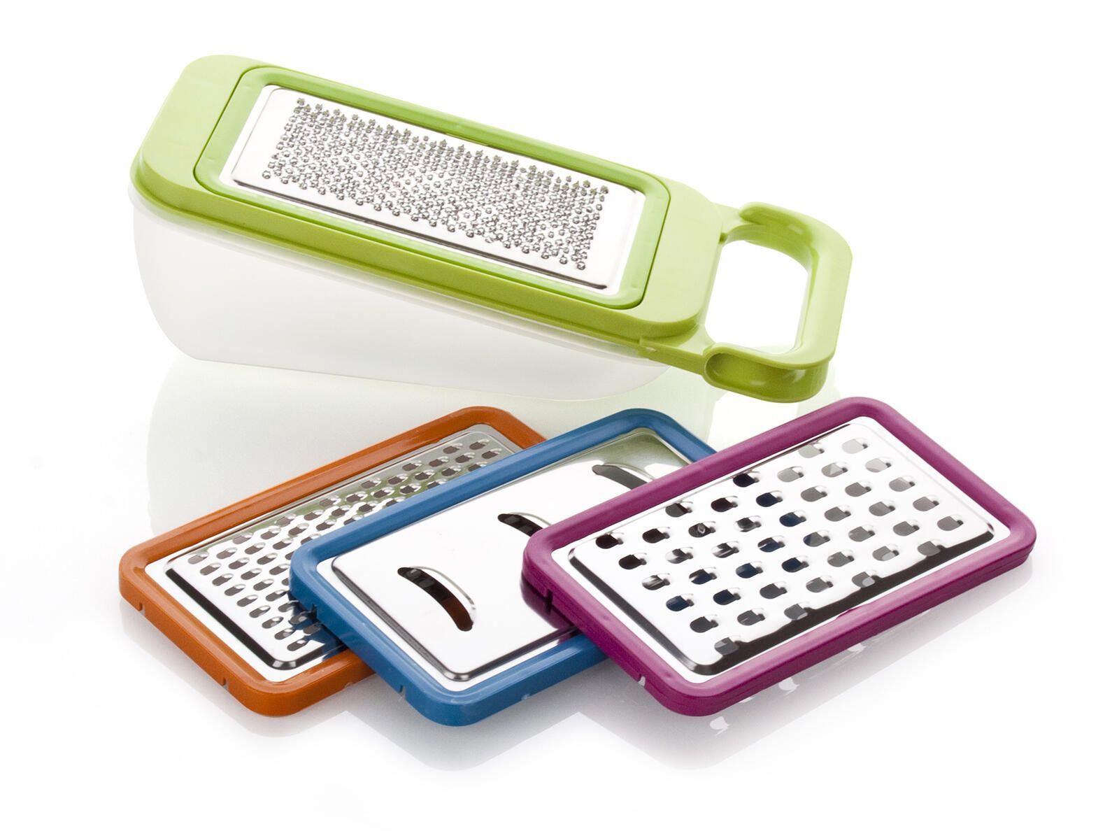4dílná sada struhadel se zásobníkem, délka 26 cm, šířka 10,2 cm, výška 10,8 cm, nerezová síta, mix barev - oranžová, růžová, zelená, modrá.