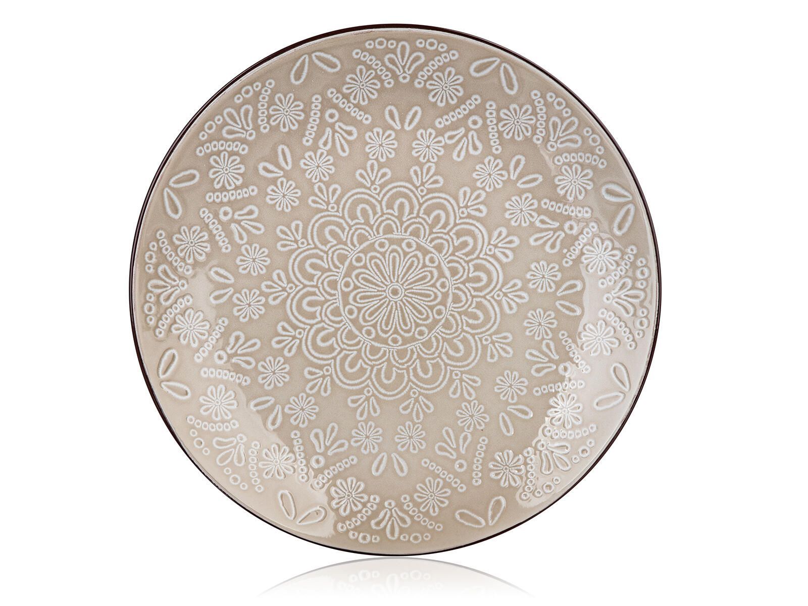 Talíř mělký SHAPE, v krémové barvě s dekorem krajky, vyrobený z keramiky.