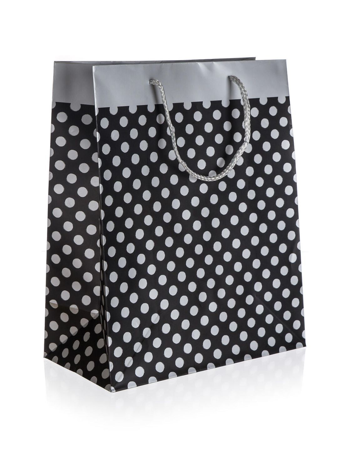 Dárková taška s dekorem STŘÍBRNÉ TEČKY, velikost XXL, je vyrobena z papíru a vybavena textilním uchem.