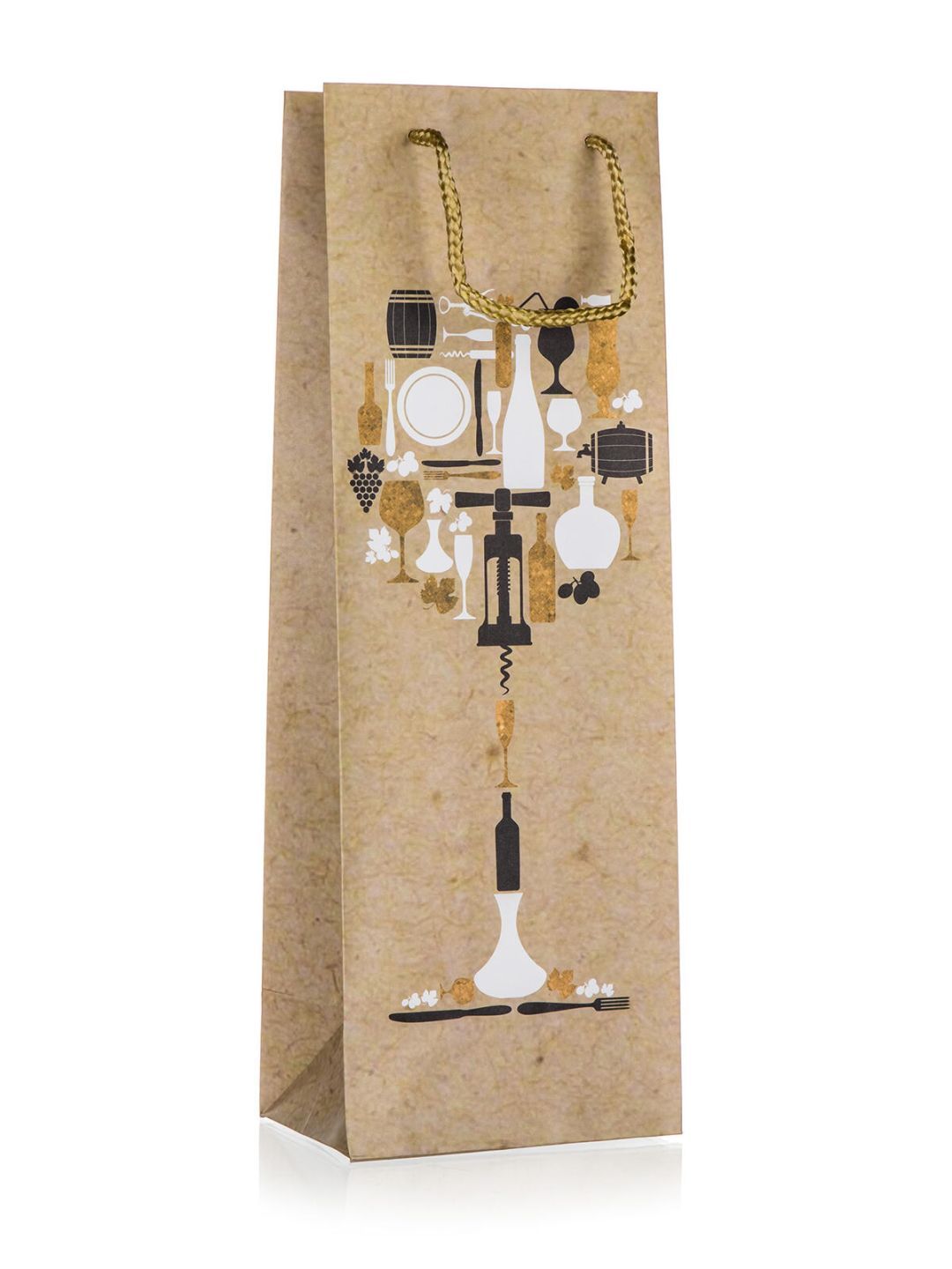 Dárková taška na láhev s dekorem, je vyrobena z papíru a vybavena textilním uchem.