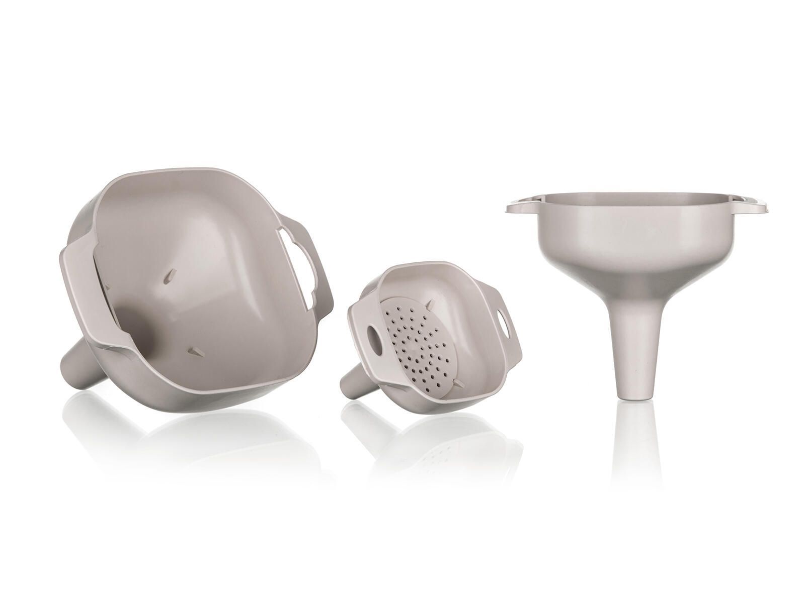 Sada plastových trychtýřu se sítkem CULINARIA slouží k pohodlnému nalévání tekutin do nádob s úzkými hrdly i jejich cezení díky sítku, které je možno vložit do každé velikosti.