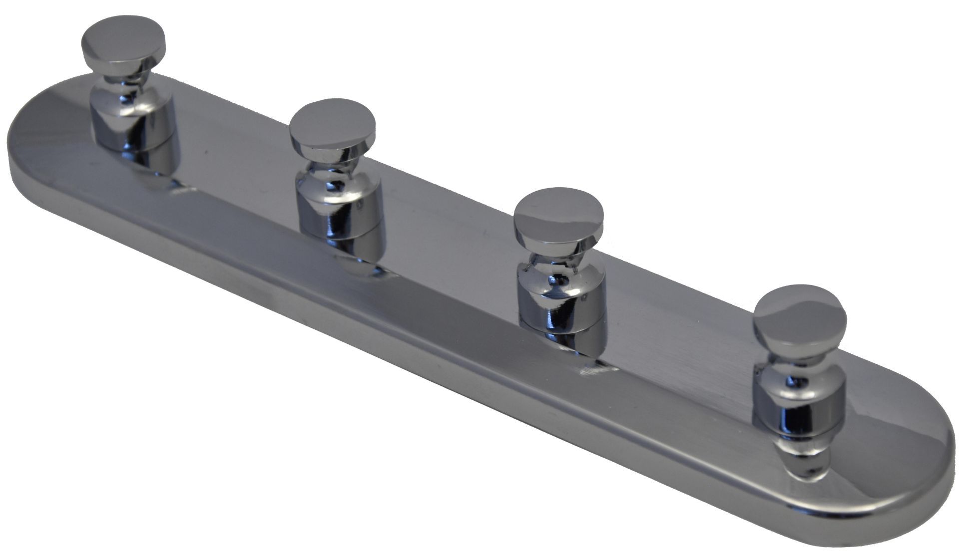 Celokovový čtyřkolíkový galvanicky pokovený šatní věšák k přišroubování.